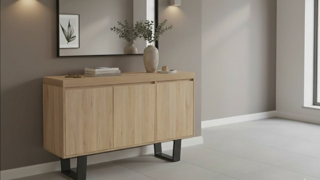 The GrainCraft 3-Door Buffet is designed for both beauty and durability. Constructed from MDF, melamine, and PVC with powder-coated black legs, this piece is a modern and elegant statement for your home. The natural colour adds instant brightness to any room, making it an ideal storage solution.